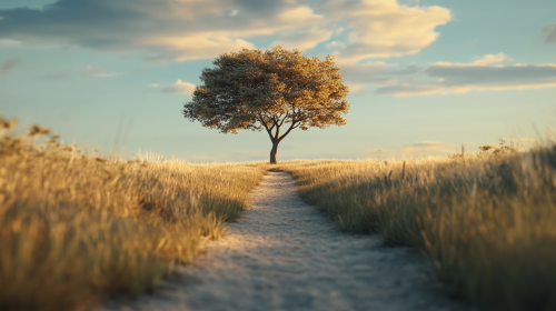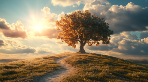Photorealistic, cinematic view of a singularly beautiful tree on a gentle hill in a vast natural landscape. A simple, naturally worn path leads toward it, perfectly centered in the frame. The tree evokes a subtle, divine presence, with a serene atmosphere and realistic lighting. --ar 16:9