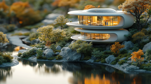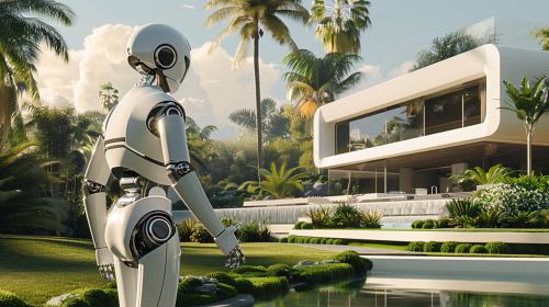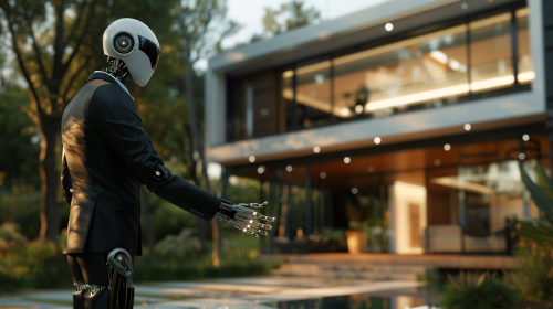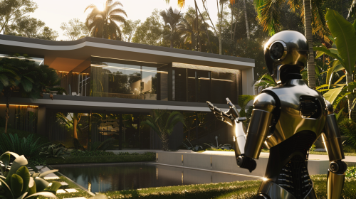 A futuristic AI Call Bot standing in front of a luxurious, modern villa, gesturing elegantly towards the property as if presenting it to a client, the villa featuring sleek architecture, large glass windows, and pristine landscaping with lush greenery and palm trees, sunlight reflecting off the villa's smooth surfaces, soft shadows cast across the garden, subtle warm light enhancing the beauty of the home --ar 16:9 --v 6.0