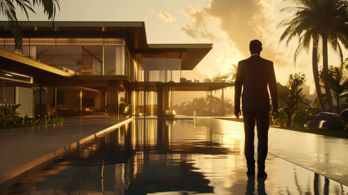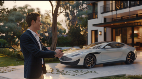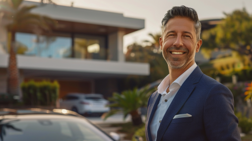 A realistic man smiling confidently, wearing a navy suit with a white shirt, shaking hands with another person in front of a high-end luxury villa. The man's features are sharp and realistic, with subtle lighting highlighting his facial details. The villa is sleek and modern, surrounded by perfectly manicured gardens and a high-end car in the driveway. Style: photorealism, detailed textures, warm lighting, luxury real estate, human realism, natural look, hd quality --ar 16:9 --v 6.0