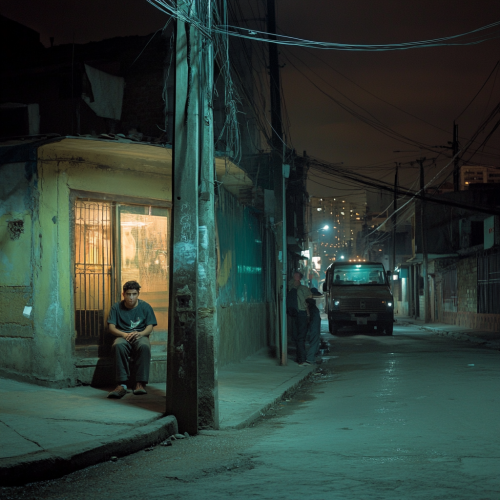 a photograph of a street in a poor neighborhood of the city, the street is not very well lit, the street is dark, the street has few streetlights on, the street looks like a dangerous street, on the sidewalk on the left, there is a Latin American guy in his 20s to 30s, the Latin American guy in his 20s to 30s is sitting in a little bus, he looks tired after a day of work and studies. standing next to the boy is Jesus Christ, watching the boy with a look of affection Jesus is emitting a glow that illuminates the boy in front of him, the glow that is emitted from Jesus and illuminates the boy in front of him, is contrasting with the dark street, 8k detail, realistic, Hyperrealistic, ultra detailed, rich vibrant colour, shot on a Sony Alpha a7 III camera –ar 9:16