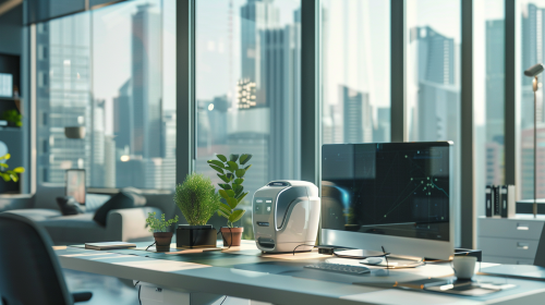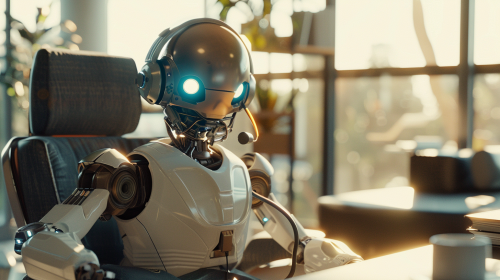 A medium shot of a human-like AI call bot sitting in a sleek modern office, wearing a futuristic headset, speaking on a call. The bot has a polished, professional appearance, working at a glass desk with real estate charts on a holographic display in the background. Soft, natural light filtering through large office windows in the late afternoon, shot with a Nikon Z7 II, 50mm f/1.4 lens, realistic tones with a subtle blue-grey palette, --ar 16:9