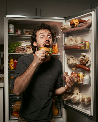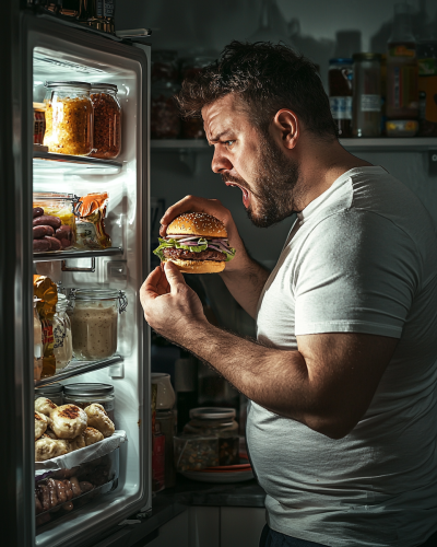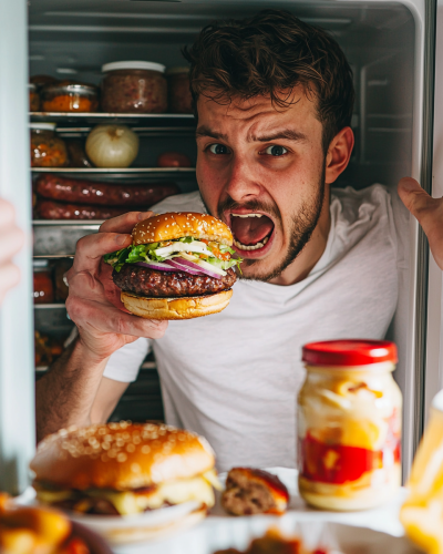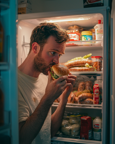 real-life close-up photo of a man half-biting into a hamburger, leaning into an open fridge packed with colorful food, taken from the side at a 45-degree angle, fridge’s bright internal light illuminating the scene with natural, neutral lighting, no filters, shot with a Canon EOS-1D X Mark III, 50mm f/1.4 lens, realistic colors and textures --ar 3:4 --style raw --quality 2
