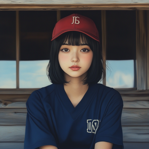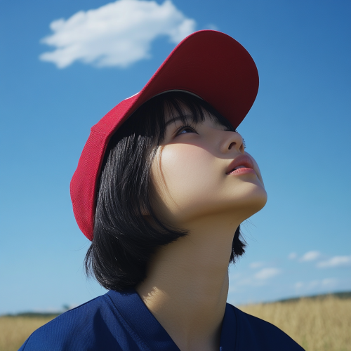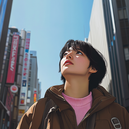 Realistic photo. Close-up of a Japanese woman looking up at the sky in Ginza, Japan under clear skies. He has black hair cut in a bob, and wears a brown jacket, pink shirt, and thick baggy pants.