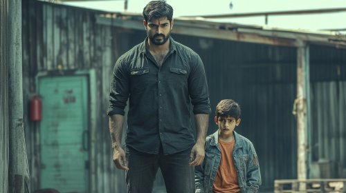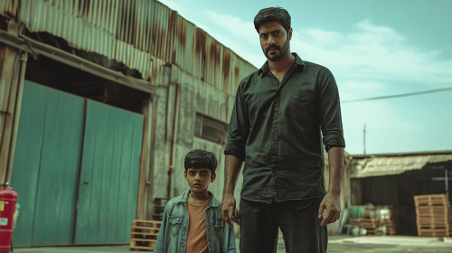 generate an image of a south indian hero in his 30s standing in an empty warehouse or industrial area. He is wearing a plain black shirt, and dark pants. He has a beard and is looking off with a serious, intense expression as if he is there for the boy. Slightly behind him, a young boy, around 10-12 years old, with short dark hair and wearing a denim jacket over an orange t-shirt and jeans, stands nervously, his face showing clear fear. The boy is glancing around cautiously, staying close to the man as if for protection. The warehouse is made of corrugated metal and has a green door with a red fire extinguisher hanging on it. There are wooden pallets scattered around the area. The sky is blue and the overall mood of the image is somber, --ar 16:9