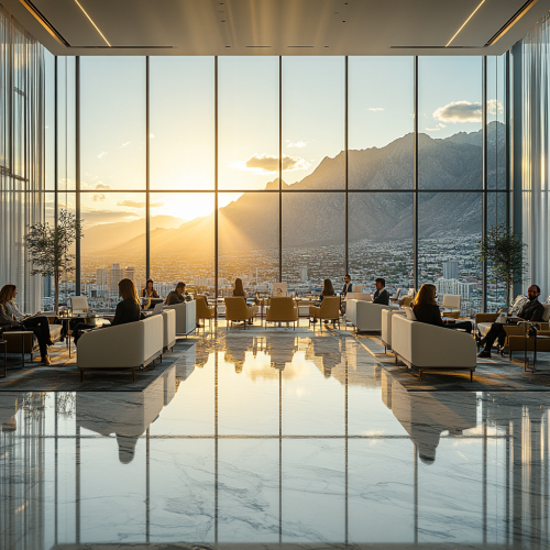 ultra high resolution, real life photo, people in a modern and luxurious meeting room, people are engaged and listening intently, the meeting room features large glass windows, high ceilings, elegant furniture, and soft ambient lighting, sunlight streaming through the windows, creating warm reflections across the polished marble floors, moderately large city and mountains in the background --s 250