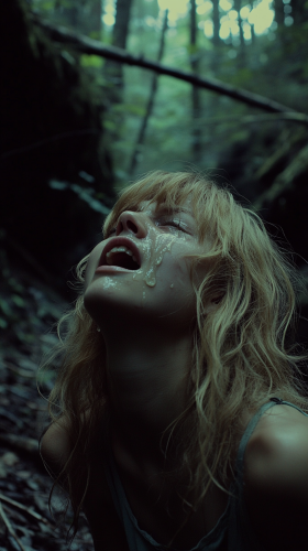 A girl falls to the ground deep in the forest and cries, tears streaming down her face. The girl is a 20-year-old Russian with blonde, permed hair. The girl is sad and hopeless and terrified, and she is crying with a broken heart. Realizing that she is about to die, the girl says goodbye to her family over the phone. This image is focused on the girl's face as if it were a photograph taken with a single-lens reflex camera. The background is deep in a dark, deep, eerie forest. A gloomy, eerie atmosphere. A photographic representation of reality. --no illustration, painting, --style raw --ar 9:16 --v 6.1