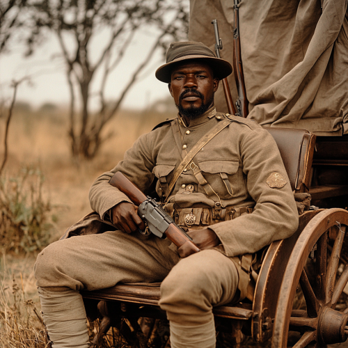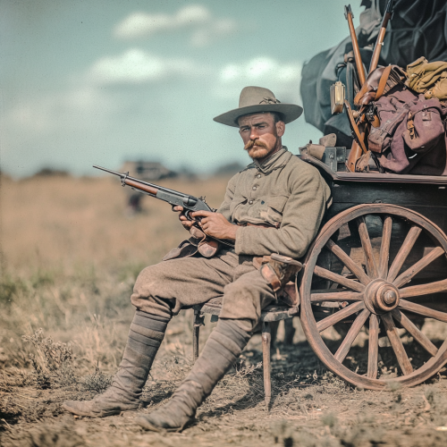 south african boer soldier holding his gun whilst sitting in front of a carriage from the same era (early 1900s). The photo must be full colour and realistic. The wagon and solider must be in full view so that it can be isolated