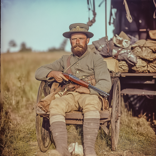 south african boer soldier holding his gun whilst sitting in front of a carriage from the same era (early 1900s). The photo must be full colour and realistic. The wagon and solider must be in full view so that it can be isolated. Photo must be side on to the wagon. The wagon and soldier must both be in focus