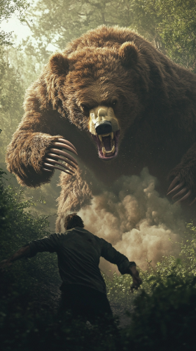 A man is struck and blown away by a huge brown bear that suddenly appears from the bushes in the forest. That brown bear is a large, ferocious and frightening brown bear. The brown bear swings its thick arm with sharp claws wide, slams it into the man's head, and blows him away. The brown bear opens its large mouth and attacks with its sharp fangs bared. The brown bear's appearance must be realistic and terrifying to clearly depict the horror of nature's fearsome beasts. The background is deep in the forest. A gloomy and eerie atmosphere. A photographic representation of reality. --no illustration, painting, --style raw --ar 9:16 --v 6.1