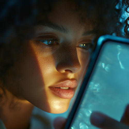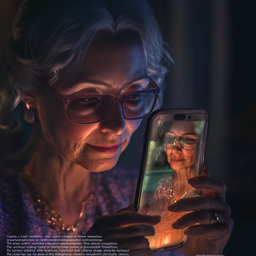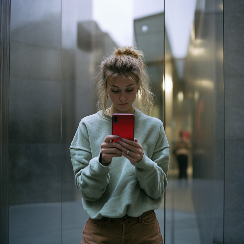 Create a wide-angle, realistic image of a 30-year-old woman standing with her back to the camera, looking at the screen of her smartphone. The phone should be held at a natural height in front of her, with her reflection clearly visible on the screen. The woman’s posture should appear relaxed yet focused, and she should be dressed casually. The scene should be framed to capture the surrounding environment in an open space, while maintaining a focus on the reflection in the phone. The overall composition should feel lifelike and natural, emphasizing the interplay between the subject and her reflection on the phone screen --style raw