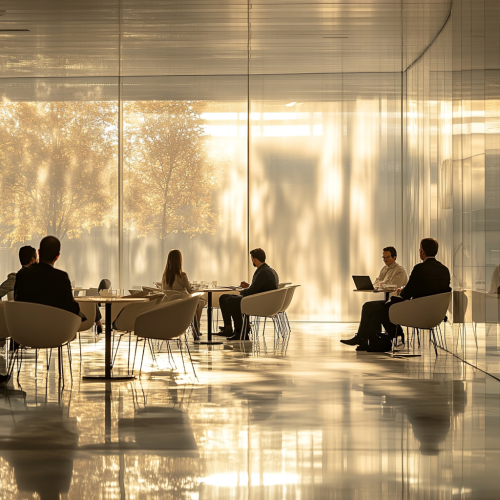 ultra high resolution, real life photo, people in a modern and luxurious meeting room, people are engaged and listening intently, the meeting room features large glass windows, high ceilings, elegant furniture, and soft ambient lighting, sunlight streaming through the windows, creating warm reflections across the polished marble floors, lush greenery visible outside --s 250