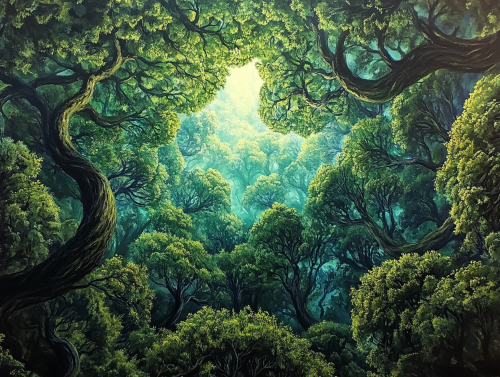 A hyper detailed oil painting of a massive, vast, lush, thick magical forest, seemingly impenetrable, with no clearings. Many of the trees are big with dark stems. The forest has a mystical energy about it. Fantasy RPG setting, wide angle. --ar 4:3 --v 6.1