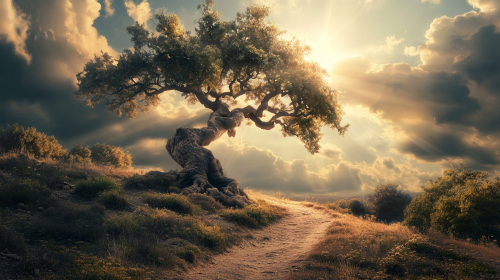 Photorealistic, cinematic view of a majestic, old tree, uneven yet balanced, on a gentle hill in a vast natural landscape. A simple, naturally worn path leads toward it, perfectly centered in the frame. The sun is high in the sky, casting strong rays through dense clouds. The sunbeams are shaped by the clouds, creating visible light shafts, realistic and immersive. The atmosphere is dry, with a serene, divine feeling, yet photorealistic and true to nature. --ar 16:9