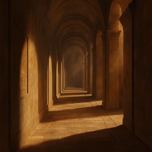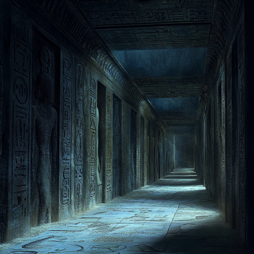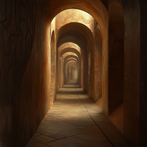 realistic, fantasy style, egyptian inspired, labyrinth tunnel, The corridor stretches ahead, bathed in a dim, shifting light. The shadows along the walls seem to move and writhe on their own, creating the illusion of figures lurking just beyond sight.