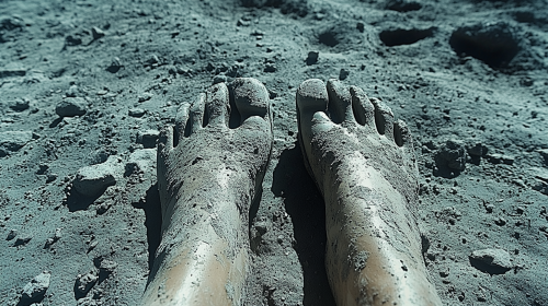 First person perspective, looking at the ground, wearing flip-flops on the feet, standing on the moon, ground gravel, real texture, SONY camera texture, high quality --ar 16:9 --fast --style raw --s 750