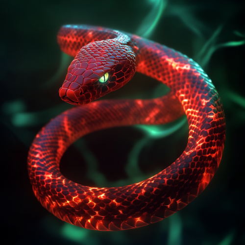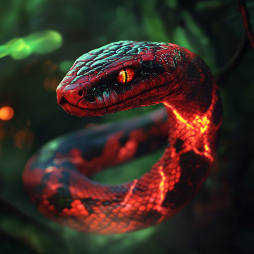 A realistic red snake coiled and slithering, with vibrant red and black patterns on its scales. The snake is set against a blurred green and dark background, creating a sense of depth and focus on the snake. The snake’s head is slightly lifted, with a glowing outline around its body to give a dynamic, energetic effect. The lighting highlights the snake’s sleek texture, and the environment has a slightly mysterious, dark ambiance.