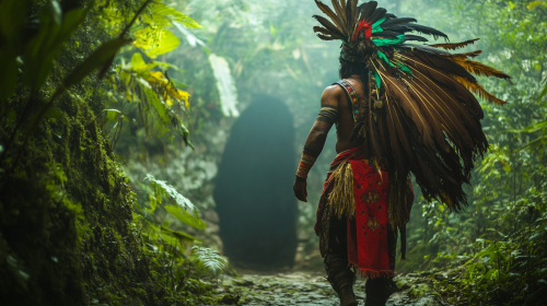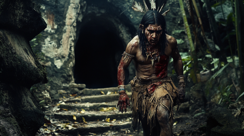 Imagine a realistic photo of an Aztec indigenous leader walking, dying and wounded in one of his sides, he holds the cut with one of his hands, the other hand is resting on the threshold of the entrance to a cave in the middle of the forest. --ar 16:9