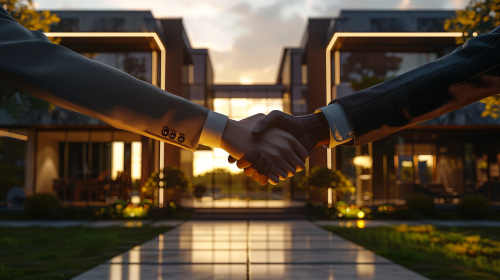 A realistic AI Call Bot shaking hands with a customer in front of a luxury villa, elegant gesture, the villa has a modern architectural design, glass windows, marble entrance, perfectly manicured lawn, rich warm lighting from the setting sun casting long shadows --ar 16:9 --v 6.0