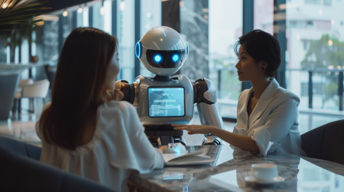 A full AI call bot consulting with a couple inside a luxurious real estate office. The bot, with a futuristic chrome finish, is presenting property details on a transparent holographic display. The couple, dressed in formal attire, looks engaged while the office setting features marble floors, large windows with cityscape views, and modern furniture. Warm lighting creates a professional atmosphere. --ar 16:9 --v 6.0
