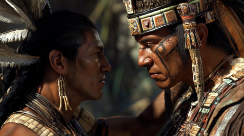 Imagine a realistic photo of an indigenous Aztec priest, he is imposing and looks severely at the Aztec leader Moctezuma II face to face, who is wounded and saddened by the priest's severe gaze. --ar 16:9