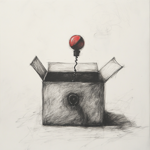 a charcoal drawing of a childs red jack in a box with a turn handle with a spring coming out with a cctv camera on the end. on a plain white paper background