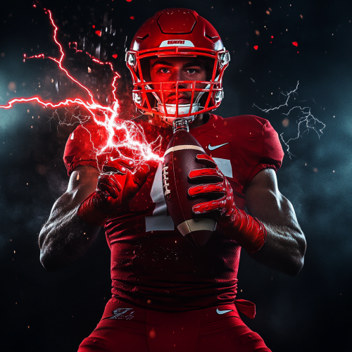 A 4k photorealistic photo of an American Football player wearing a red uniform holding in his hand lightning in a glass bottle. Dark and dramatic setting