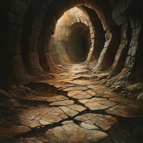 realistic, fantasy style, egyptian inspired, labyrinth tunnel, The floor of the corridor is uneven and cracked, with jagged stones jutting out at odd angles. Each step is accompanied by the unsettling sound of shifting rock, as if the ground could give way at any moment.