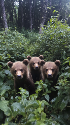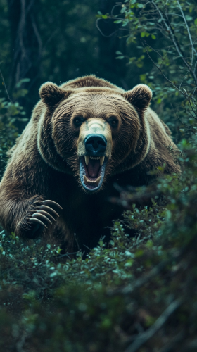 A huge brown bear suddenly appears out of the bushes in the forest. It is a large, ferocious, and frightening brown bear. The brown bear attacks with its sharp claws raised wide, its large mouth open, and its sharp fangs bared. The appearance of the brown bear must be realistic and terrifying, conclusively depicting the horror of nature's fierce beasts. The background is deep in the forest. The atmosphere is gloomy and eerie. A photographic representation of reality. --no illustration, painting, --style raw --ar 9:16 --v 6.1