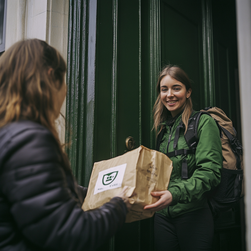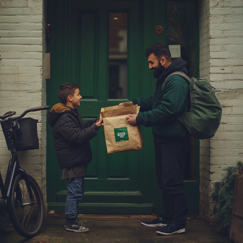movie still, documentary photography, a editorial, Martin Parr style delivery scene: a woman smiling as she receives a food delivery from an Uber Eats delivery person standing at her front door. The delivery person, dressed in a green and black uniform with a large square Uber Eats bag on their back, hands over a brown paper bag with the Uber Eats logo. A bicycle is parked nearby, leaning against the door. The setting is in front of a large, dark green wooden door, and the atmosphere is casual and friendly. High level of detail, realistic lighting, documentary photography, street style, 35mm.