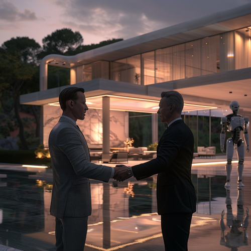 A professional AI call bot shaking hands with a businessman, the man looking natural and realistic, with close-cropped hair, wearing a tailored suit. The villa in the background is grand, with a large glass facade and marble accents. The handshake is firm and symbolizes a closed real estate deal. Soft lighting enhances the luxury and sophistication of the scene. Style: hyperrealism, soft shadows, luxury property, high-end details, professional attire, natural textures, hd quality --v 6.0
