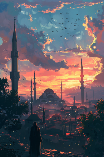 A photorealistic cover illustration of a Turkish imam standing at the crossroads of two worlds, one side featuring a peaceful Turkish village with a minaret, warm sunset colors, and earthy tones, the other side a cold, industrial German cityscape under a cloudy sky, muted blue and gray hues. The imam, a silhouette walking between these two environments, holds prayer beads. Faint Quranic text integrated into the background, subtle but symbolic. Title in bold serif font at the top, evoking tradition and depth --ar 2:3 --v 6.0