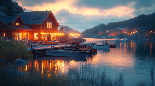 Ultrarealistic image Zara Bershka h&m Depth of field, Tilt blur, Shutter speed 1/1000, F/22, White balance, 32k, Super resolution, Pro Photo RGB with complex details of a new low-rise eco-resort at the summer Golden Hour on a desolate Newfoundland coastline showing with cod fishing trawlers moored along a dock. --ar 16:9 --s 500 --v 6.1