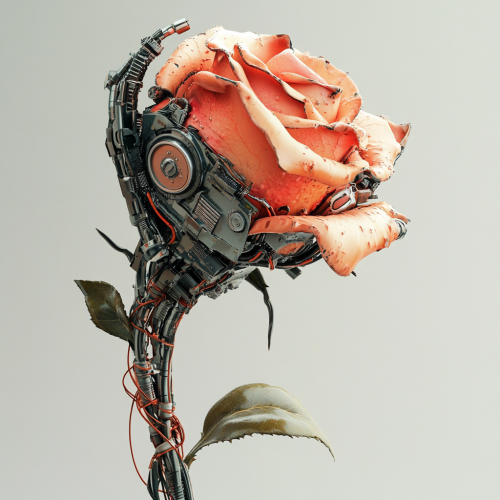 robotic flower blended with real flowers, dynamic circuits, motherboard, wires, realistic flowers, 3d, highly detailed, robot parts, single rose with thorny stem