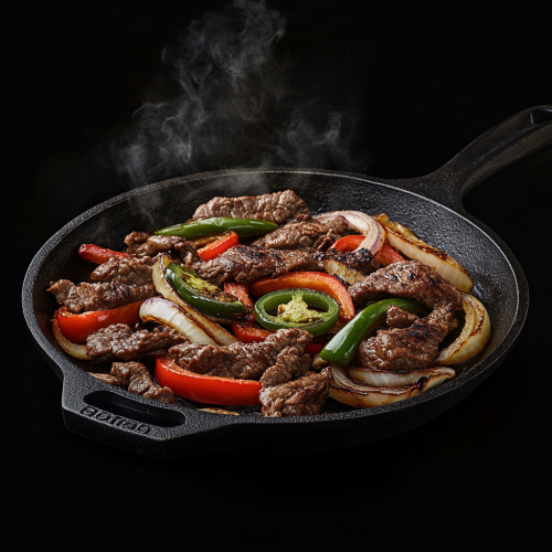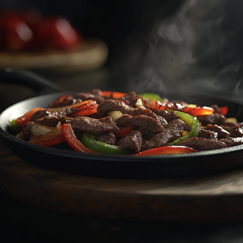 fajitas on a shallow hot cast iron griddle pan shot at an angle with steam rising, photorealistic food product image, there is sizzling beef on the plate with some red bell pepper, onions and jalapeno but it does not crowd the pan