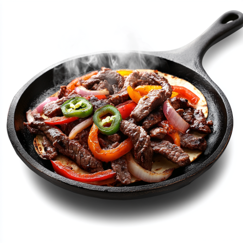 fajitas on a shallow hot cast iron griddle pan shot at an angle with steam rising, photorealistic food product image, there is sizzling beef on the plate with some red bell pepper, onions and jalapeno but it does not crowd the pan, no background and the whole pan is visible including the handle