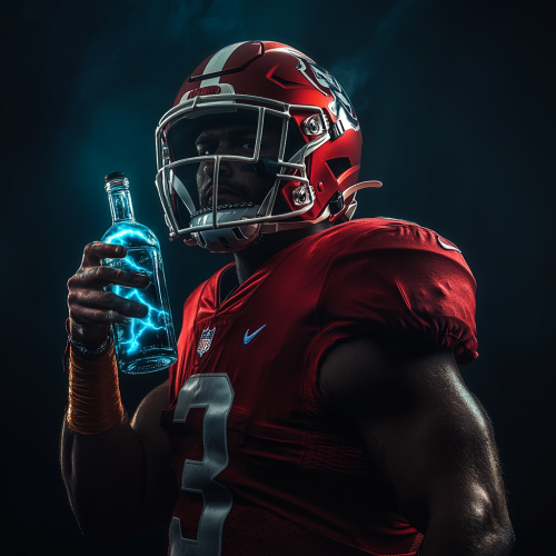 A 4k photorealistic photo of an American Football player wearing a red uniform, standing straight up, holding in his right hand a closed corked glass bottle of blue lightning. Dark and dramatic setting