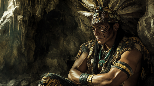 Imagine a realistic photo of the spirit of an indigenous Aztec leader in a cave, he is imposing and has both arms crossed as a sign of rejection, looking severely at the Aztec leader Montezuma II, who is wounded and saddened by the severe gaze of the spirit. --ar 16:9