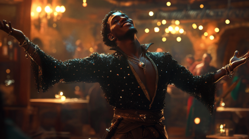 black male bard, wearing black glittery doublet, slim skinny young, youthful face, dark skin, performing on stage in tavern lit by ambient lighting, full body portrait, style of video game character concept art, --ar 16:9