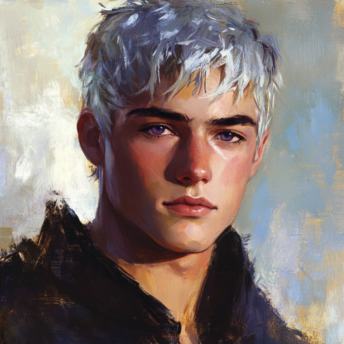 An 18-year-old Valyrian youth from House Velaryon, with short silver hair that shimmers in the light and intense violet eyes, radiates a natural charm that draws people to him. His handsome features are unmistakably masculine, with a strong jawline and a confident, easygoing smile that makes him approachable. Though he lacks the hardened appearance of a warrior, he carries himself with a relaxed yet distinctly male elegance. Girls are especially drawn to his friendly, likable demeanor. Picture him painted in the soft brushstrokes of Impressionism, where the light plays off his silver hair and violet eyes, creating a portrait full of warmth, capturing his youth and quiet confidence, clearly portraying him as a striking young man, not at all feminine in appearance.