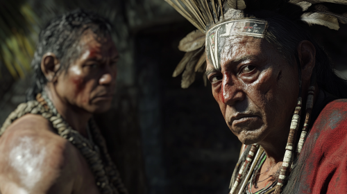 Imagine a realistic photo of an indigenous Aztec priest, he is imposing and looks severely at the Aztec leader Moctezuma II, who is wounded and saddened by the priest's severe gaze. --ar 16:9
