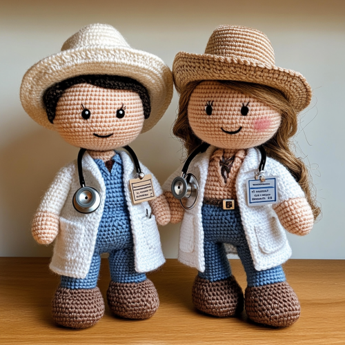 wo knitted dolls resembling American cowboys, wearing typical medical uniforms with stethoscopes, white lab coats, and scrubs. The dolls should be detailed with soft yarn textures, showing facial expressions of professionalism and compassion. They should be posed standing next to each other, one male and one female doctor, with subtle details like name badges and medical tools in their pockets. The overall style should be cute yet realistic, with a handmade, cozy aesthetic.