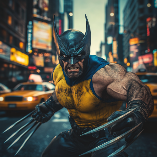 Real photo of Wolverine, the iconic Marvel Comics character, back,standing in the middle of a bustling street in New York City, without his mask. Its adamantium claws are extended, shining under the bright lights of the city. The scene captures the city with yellow taxis passing by, skyscrapers that rise above and neon signs that illuminate the night. Wolverine’s rough real face, with his intense expression, is shown with a hyper-realistic detail. His muscular physique is highlighted, and his characteristic yellow and blue costume looks worn out in battle but resistant.
