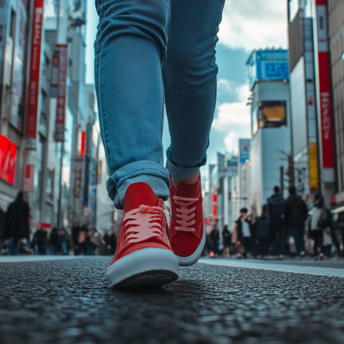 Realistic photo. The feet of a woman walking in Ginza. Red sneakers can be seen on the baggy denim pants. During the week, you can see a lot of shoes and feet coming and going.