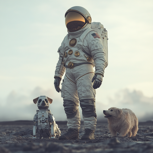 A picture of cosmonaut wearing a spacesuit by Nike, droid robot dog next to him, extreme cushioning, puffer material, antigravity design, innovative design, rugged materials, advanced technology, light grey moon surface style raw --style raw --s 250
