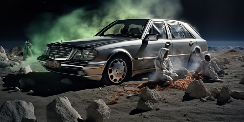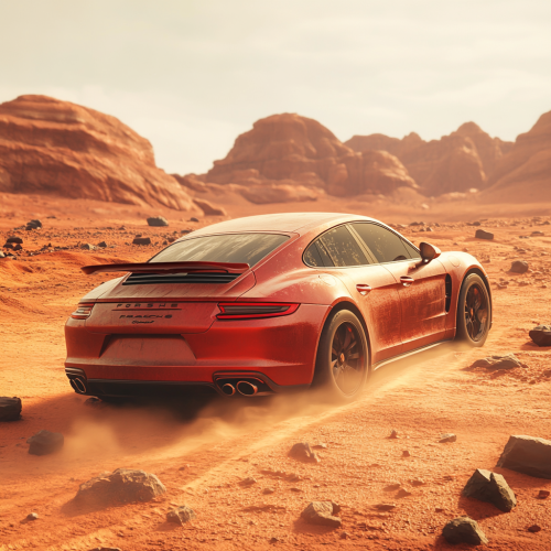 realistic red Panamera 911 car traveling on the light orange color surface of Mars. When the vehicle moves, the pieces of rock and dust on the surface of the ground are scattered. Also, the orange and white color mix sky is visible from the background,hight detail,high quality,--ar 9:16