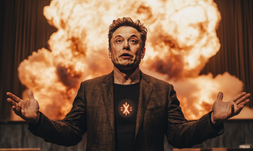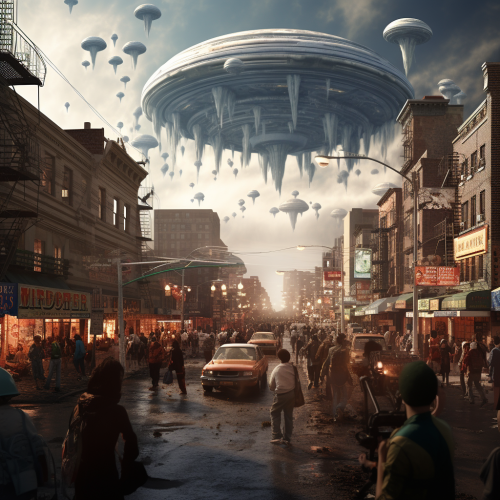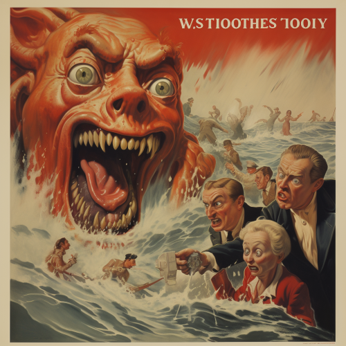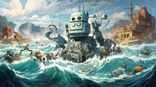 A giant wave made of many different, goofy looking robots instead of water. Animated in a humourous cartoon style. --v 5.2 --ar 16:9