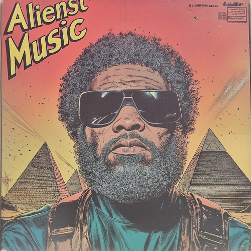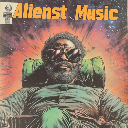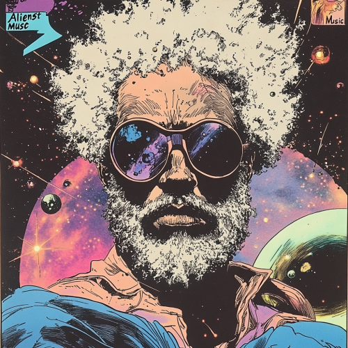 1970's marvel comic book with the title "Alienst Music" featuring a grey bearded afrocentric man wearing dark shades escaping oout of a black hole in space in a mystic chair sending out telepathic signal