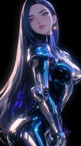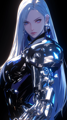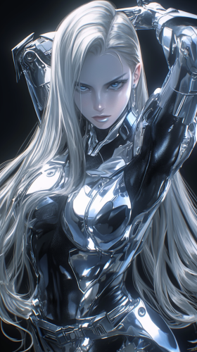 80s anime, beautiful villain woman with long hair in the style of Yoji Shinkawa and final fantasy artstyle, cinematic lighting, sharp shiny chrome metallic plunge suit, black background, chromed silver reflections, chrome reflections on body parts, by Masamune Shirow, Hajime Sorayama, Hiroshi Nagai, Ilya Kuvshinov, tetsuo harano, Ross Tran, by Greg Rutkowski --ar 9:16 --s 750 --niji 6
