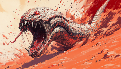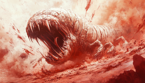Grimdark Fantasy. Tremors. An armored worm exploding out of red sand desert. Based on Graboids. Eye catching Portrait in the style of Steve McNiven. High contrast bright colors. Red and White Background. Gritty action. Underdog. --ar 7:4