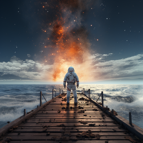 an astronaut stands on an old wooden pier looking out over the vast ocean as a meteor crashed towards earth. 3D,Leica 50mm, Kodak portrait 800, 100 vibes, photorealistic, fujifilm velvia vibes, 50, Hasselblad x1d ii quality, Unreal Engine 5, Depth of Field, 32k, Super - Resolution, Megapixel, ProPhoto RGB, VR, tall, epic, art-germ , alex ross, Half - rear Lighting, Backlight, Natural Lighting, Incandescent, Optical Fiber, bright Lighting, Cinematic Lighting, Studio Lighting, Soft Lighting, Volumetric, Contre - Jour, dark Lighting, Accent Lighting, Global Illumination, Screen Space Global Illumination, Ray Tracing Global Illumination, Red Rim light, cool color grading 45% , Optics, Scattering, Glowing, Shadows, Rough, Shimmering, Ray Tracing Reflections, Lumen Reflections, Screen Space Reflections, Diffraction Grading, Chromatic Aberration, GB Displacement, Scan Lines, Ray Traced, Ray Tracing Ambient Occlusion, Anti - Aliasing, FKAA, TXAA, RTX, SSAO, Shaders, OpenGL - Shaders, GLSL - Shaders, Post Processing, Post - Production, Cel Shading, Tone Mapping, CGI, VFX, SFX, insanely detailed and intricate, hypermaximalist, elegant, hyper realistic, super detailed